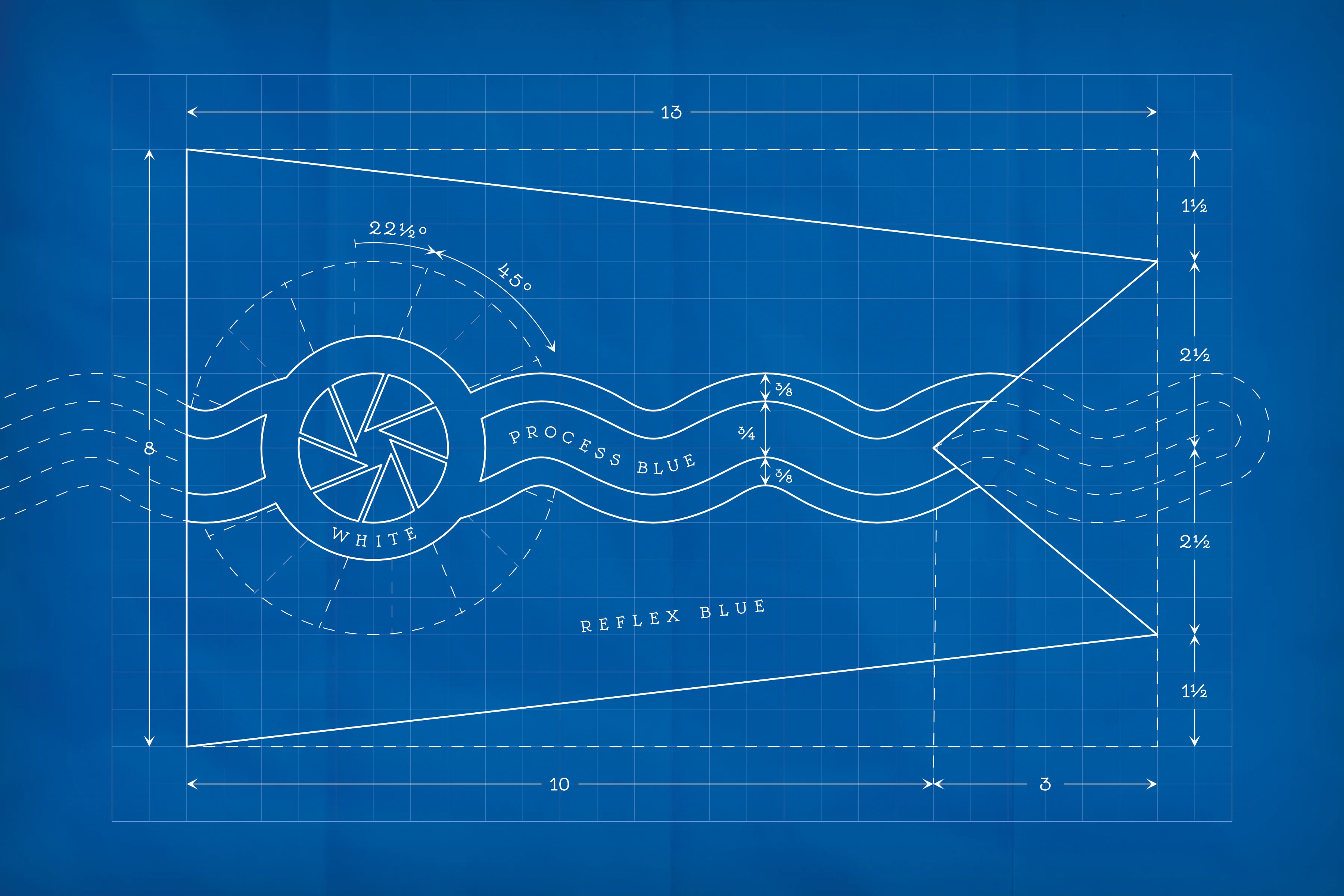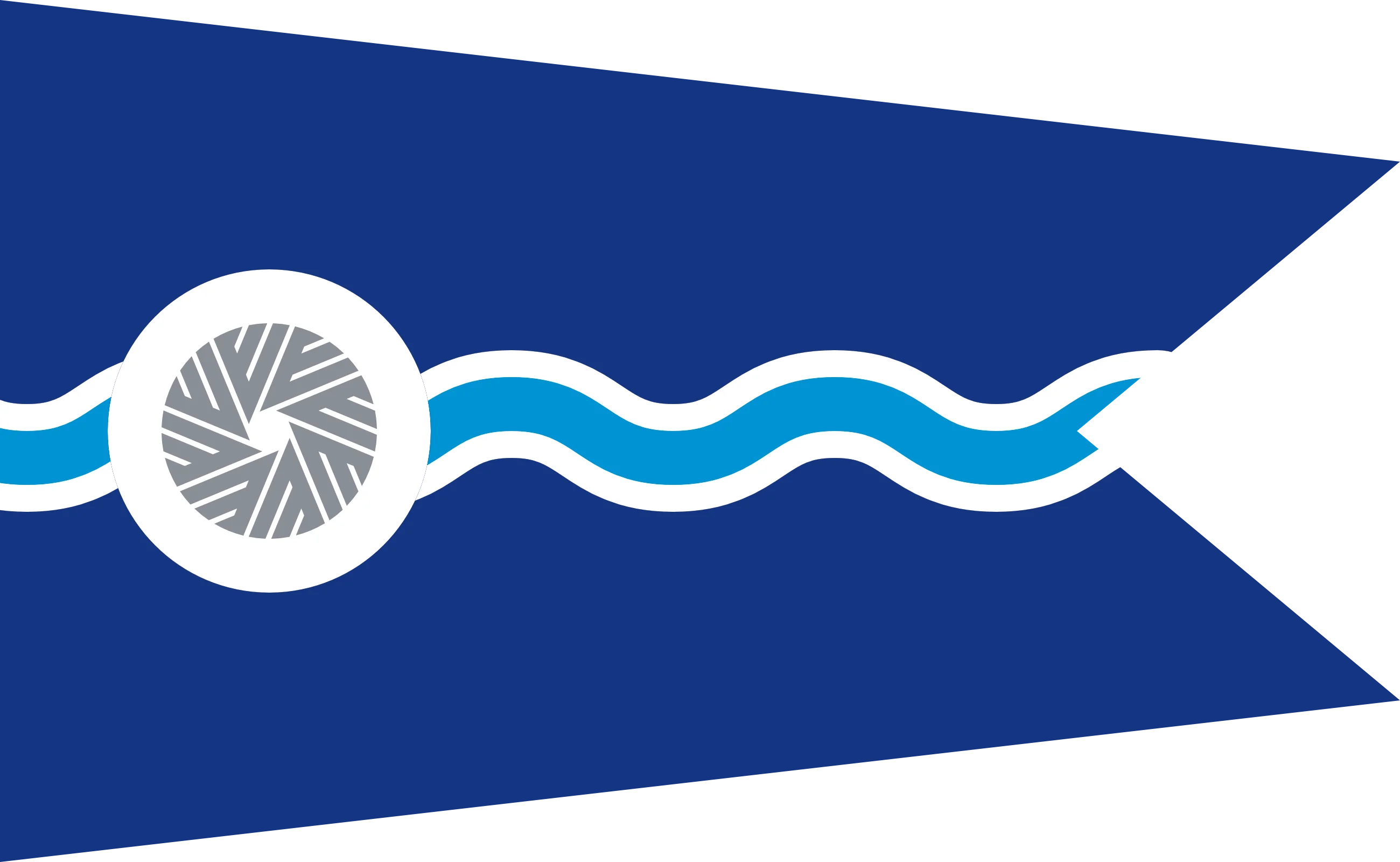 The swallowtail shape of the flag – called the Ohio Burgee – pays homage to the 1901 state flag designed by Cleveland architect John Eisenmann. A single, wavy blue stripe runs horizontally across the center of the field, representing the Chagrin River that bisects the village. The blue stripe is bordered by narrower, white stripes symbolize the foaming water of the river’s rapids and falls. In tribute to Chagrin Fall’s history as a mill town, a stylized millstone made of eight gray wedge shapes is centered vertically on the flag’s hoist.